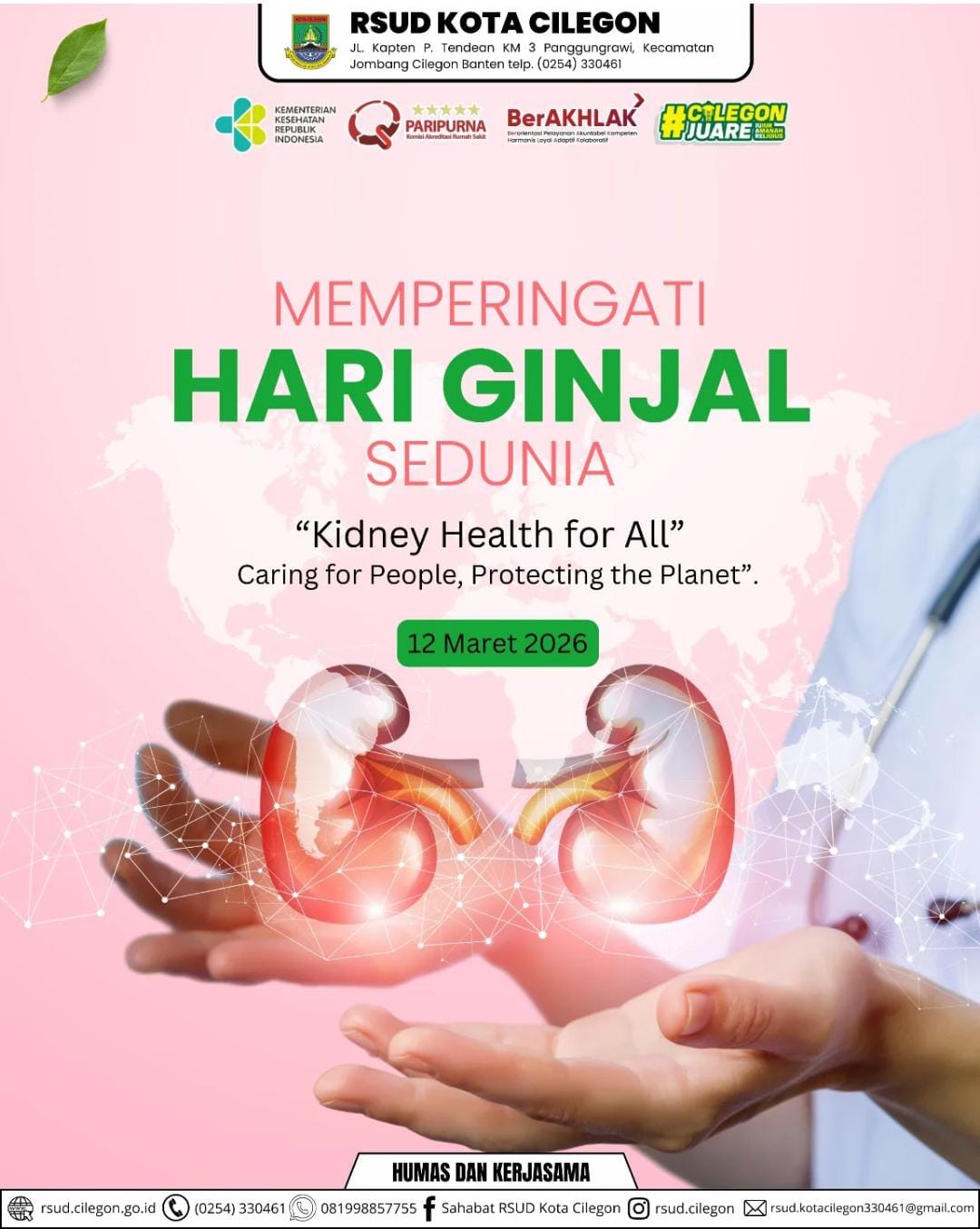 <p>Ginjal bekerja tanpa henti setiap hari untuk menyaring racun, menjaga keseimbangan cairan dan mendukung kesehatan tubuh kita. Dihari ginjal Sedunia mari kita ingat bahwa menjaga kesehatan ginjal bukan hanya untuk hari ini, tetapi untuk sepanjang hidup. Mulai dari hal sederhana, minum air putih yang cukup, pola makan yang sehat, rutin berolahraga dan melakukan pemeriksaan kesehatan secara berkala.</p>
